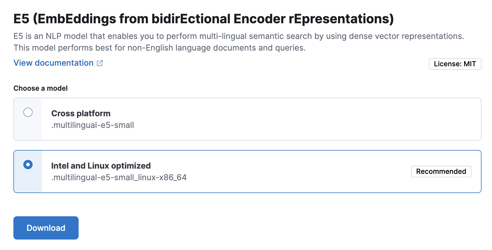 E5 has two versions: one cross-platform version which runs on any hardware and one version which is optimized for Intel® silicon. The Model Management > Trained Models page shows you which version of E5 is recommended to deploy based on your cluster’s hardware. However, the recommended way to use E5 is through the inference API as a service which makes it easier to download and deploy the model and you don’t need to select from different versions.